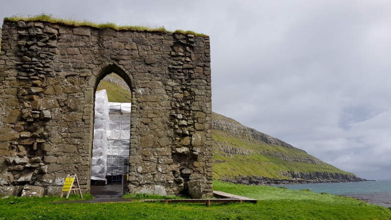 Bei windigem Regenwetter wandern wir heute mit dem UAZ nach Kirkjubøur, einem Ort im Südwesten der Insel Streymoy. Hier erleben wir gleich drei typische Färöer Sehenswürdigkeiten direkt am Atlantik: