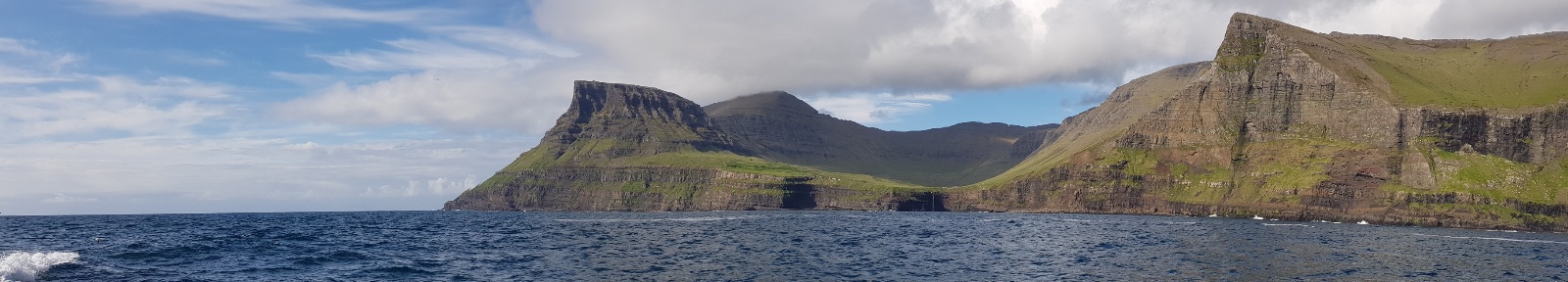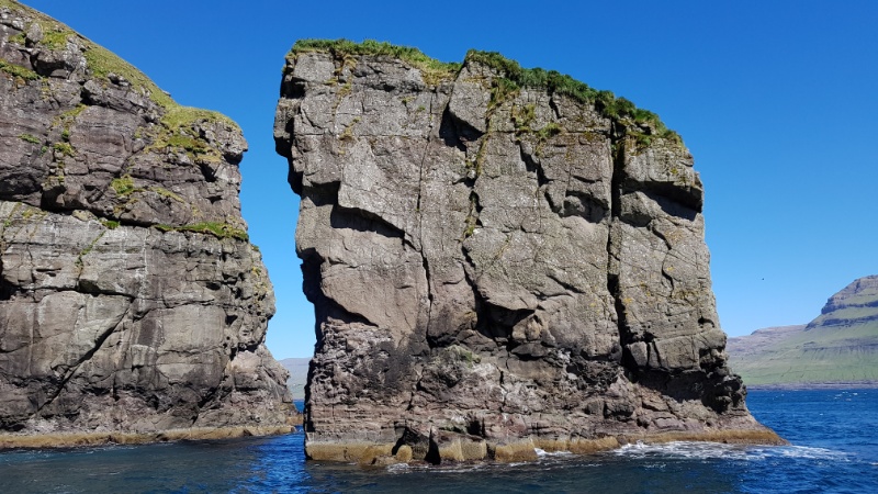 Auf einer Vogelklippen-Bootstour (die wegen des Wetters mehrfach verschoben wurde) erleben wir heute Vogelwelt, Felsgrotten und sogar noch einmal Trøllkonufingur aus unmittelbarer Nähe (und in voller Größe ). Genau genommen fahren wir sogar durch das Fundament der „Hexe“