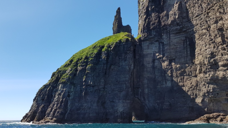 Die See ist ruhig, aber die Wolken hängen regenreich und schwer über dem Wasser und nur für eine sehr kurze Zeit schafft es der Wind, den Blick auf die über 300m hohe Felsnadel an der Südküste freizublasen.
