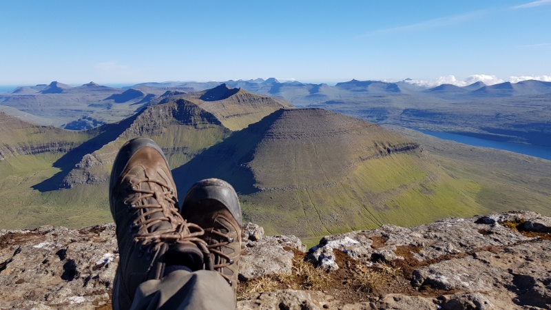 Der 882m hohe Berg macht es uns mit seinem steilen und feucht-rutschigen Aufstieg nicht ganz leicht, aber wir sind mit dieser Strapaze nicht allein. Denn bei den Färingern (so lesen wir) ist es Tradition, diesen Berg zur Mitsommernacht zu besteigen und mit Freunden und Familie zu feiern. Genial!