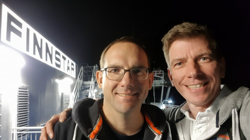 Die Fahrt zum Skandinavienkai in Travemünde verläuft ohne technische Probleme. Und man merkt schon jetzt, dass wir in den Norden gefahren sind: Bei 30°C sind wir eingestiegen und bei 15°C wieder ausgestiegen. Das nächtliche Einschiffen ist sehr kurzweilig - Dank OLGA kommen wir mal wieder viel ins Gespräch!