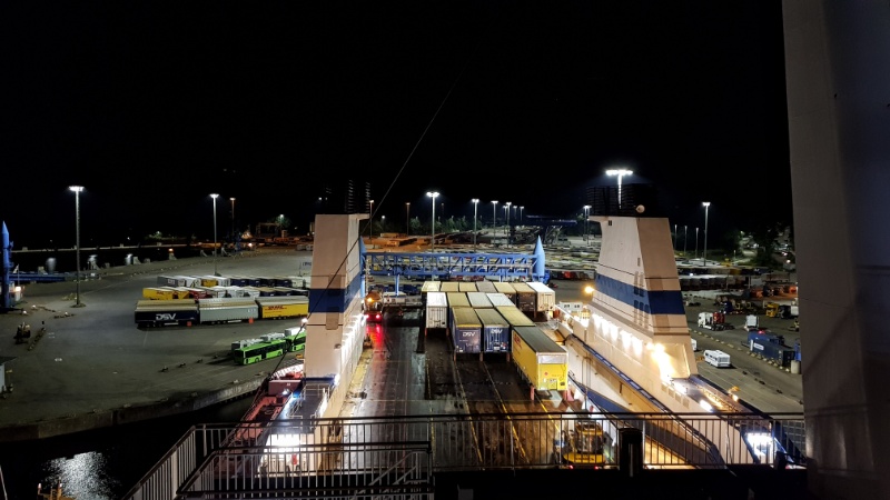 Die Fahrt zum Skandinavienkai in Travemünde verläuft ohne technische Probleme. Und man merkt schon jetzt, dass wir in den Norden gefahren sind: Bei 30°C sind wir eingestiegen und bei 15°C wieder ausgestiegen. Das nächtliche Einschiffen ist sehr kurzweilig - Dank OLGA kommen wir mal wieder viel ins Gespräch!