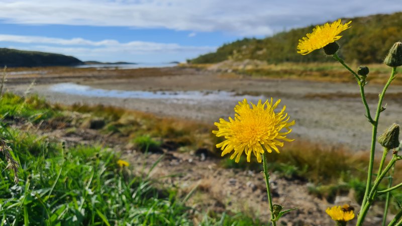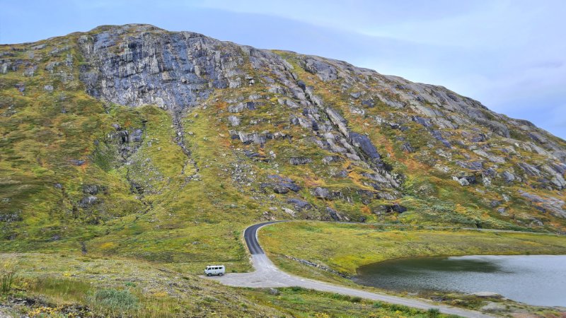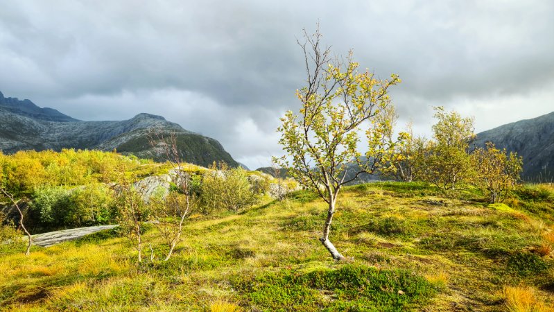 Wir verlassen den Kystriksveien und fahren über den Kulturveien durch herrliche Küsten- und Fjell-Landschaften. - Selbst bei Schmuddelwetter wirkt das herbstliche Gelb der Wiesen und Birken ganz betörend.
