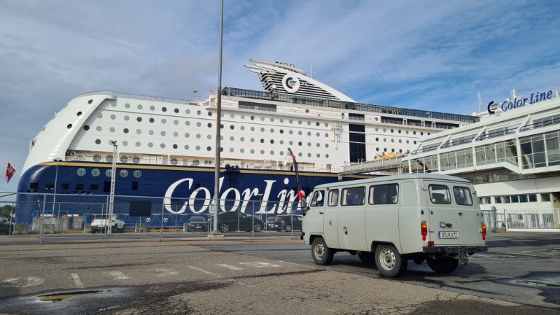 Am Fährhafen angekommen, macht unsere Olga in vielerlei Hinsicht großen Eindruck. Wie so oft interessieren sich viele Leute für unseren kleinen Bus. Aber lange reden können wir nicht, denn wir dürfen diesmal schon vor allen anderen PKWs aufs Schiff und parken zusammen mit LKWs auf dem untersten Deck.