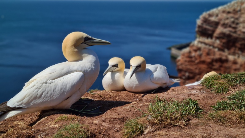 - Die imposanten Basstölpel haben sich die oberen Etagen gesichert und gestatten uns einen vorsichtigen Blick auf ihre „Liebkosungen“, sie verweisen die Lummen auf die unteren Plätze