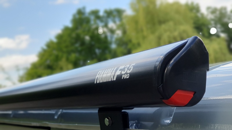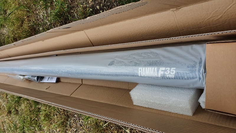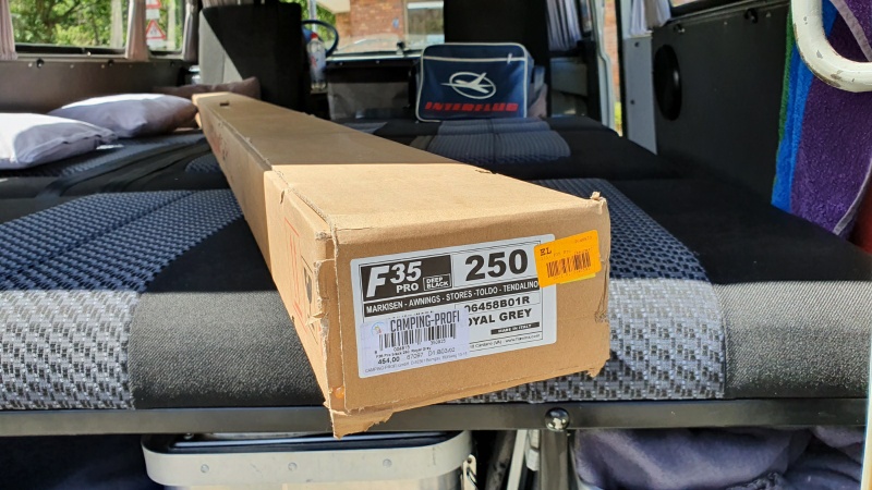 Die Wahl fiel auf die Fiamma F35Pro . Sie ist kompakt (im schicken Alugehäuse), zwar ohne Kurbel, aber dafür mit 11,5kg nicht zu schwer (und im Sonderangebot nicht so unverschämt teuer wie andere Kurbelmarkisen). Die Länge von 2,5m ist perfekt um die „gerade Seite“ der Olga gut auszunutzen.