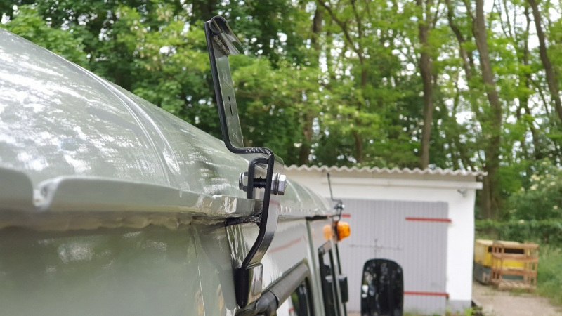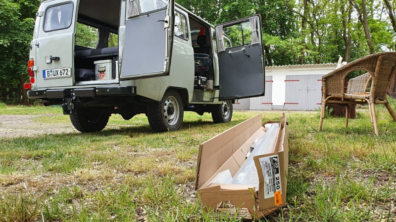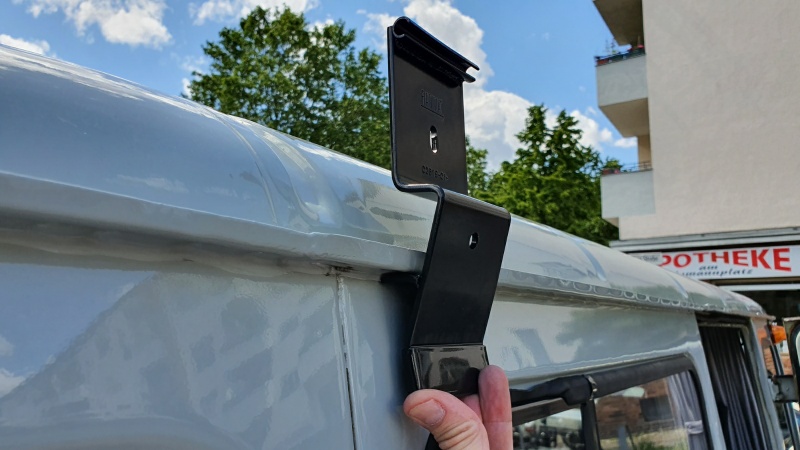 Für die Montage können wir vom „alten“ Volkswagen profitiert. Es gibt passende Adapter für den VW T3. Da der UAZ 2206 auch eine (ähnliche) Regenrinne hat, ist der Adapter fast 1:1 verwendbar. Da die Seitenwände des T3 jedoch nicht so „steil“ sind wie beim UAZ, musste der untere Teil des Adapters (Stützfuß an der Karosse) noch leicht bearbeitet werden (nur gebogen).