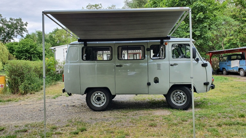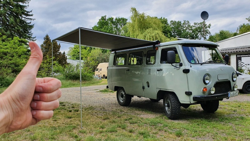 2019 war Olga acht mal im Camping-Einsatz. Auf Dauer war uns das Tarp-Vordach zu fummelig und bei Wind einfach zu laut. Vier Jahre haben wir gewartet, und uns 2020 endlich dazu durchgerungen eine echte Markise anzuschaffen.