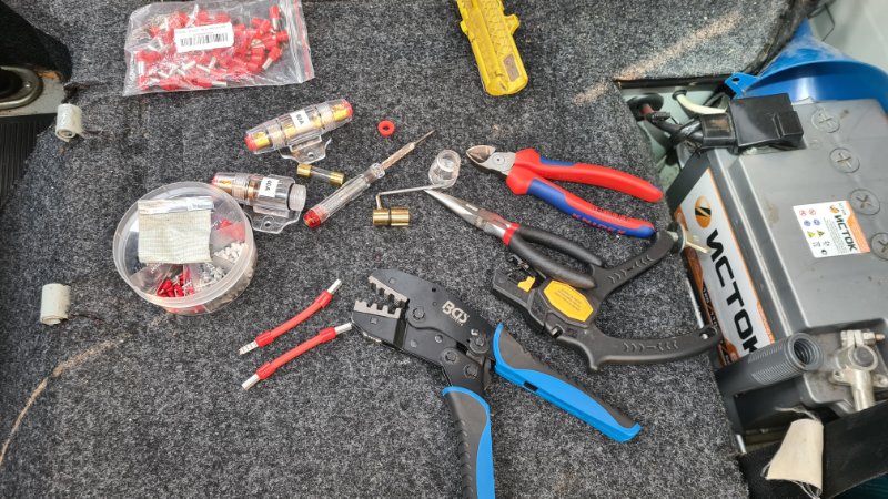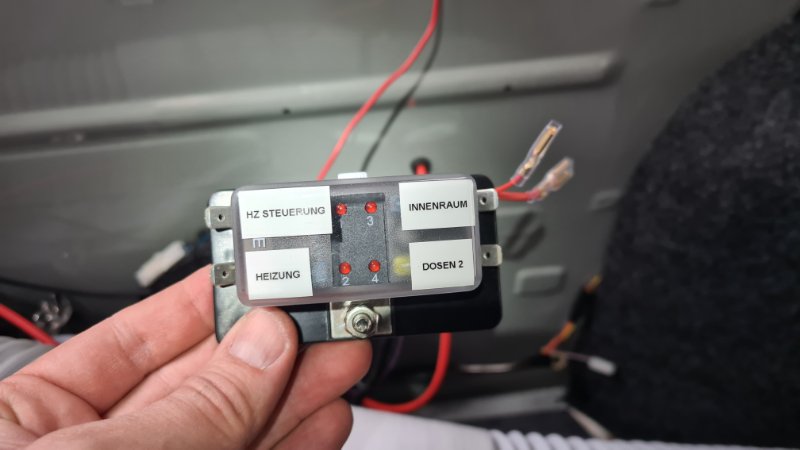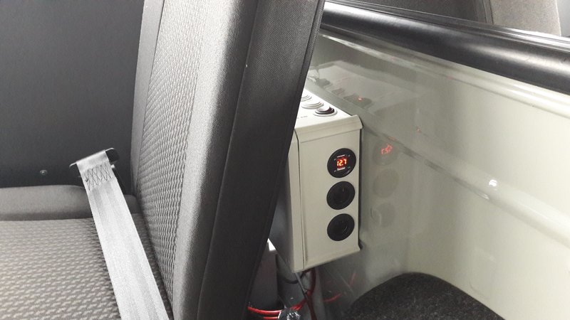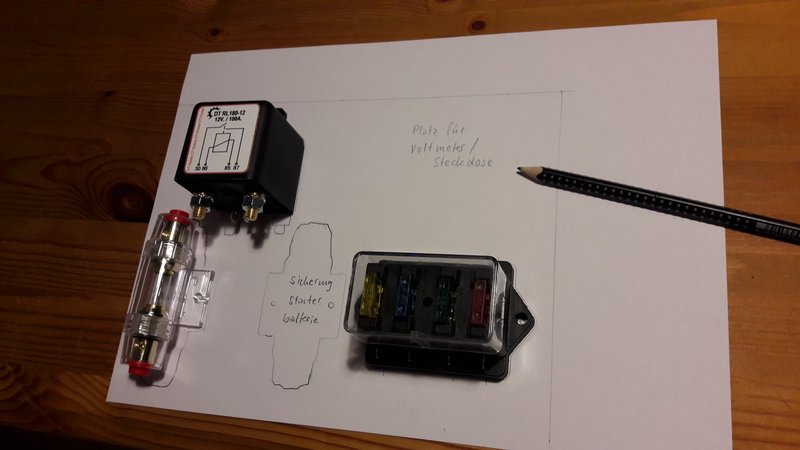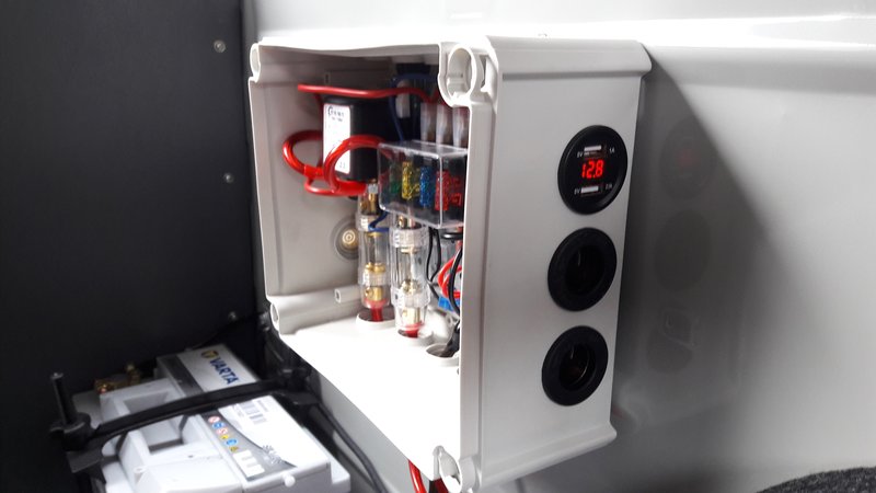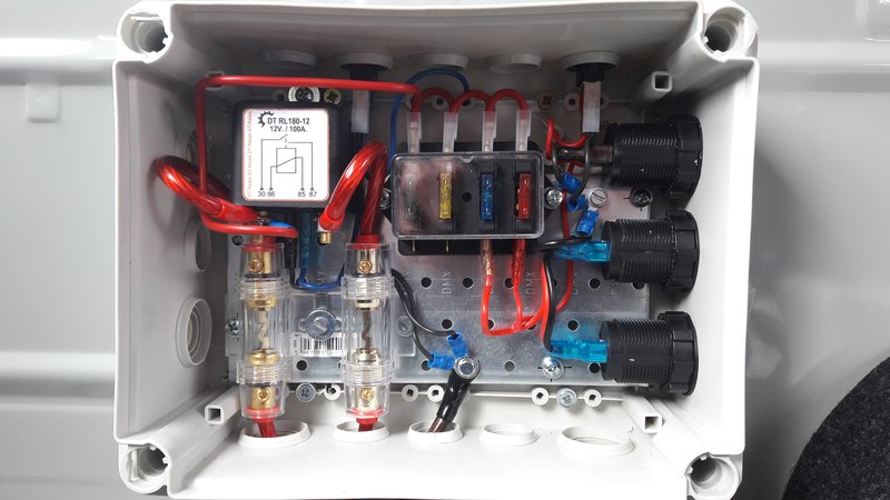 Damit das kleine russische „Campingbrot“ auch ein wenig autark laufen kann, sollte eine Zweitbatterie rein. Energie für 3h Kühlen oder Heizen - ohne danach nicht mehr Starten zu können. Ein Schaltkasten mit Trennrelais und Spannungsüberwachung soll Anschlussmöglichkeit für weitere 12V Verbraucher (2x KFZ-Steckdosen), Ladestation für Mobiltelefone (2x USB-Steckdosen) bieten und das manuelle oder automatische Trennen der Batterien ermöglichen. Dafür wurde das D+ Signal der Lichtmaschine abgegriffen.