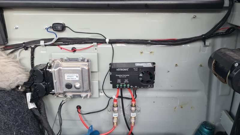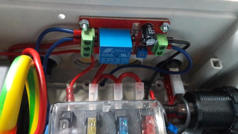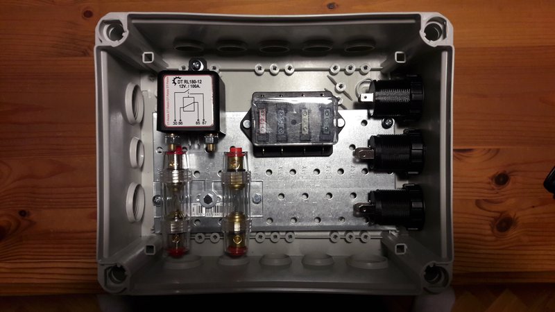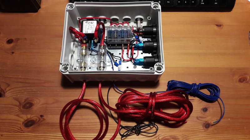 Also wurden nun ordentliche Kupferkabel (16mm^2) verlegt. Und nach einer Zwischenlösung mit einem Softwaregesteuerten Relais, habe ich mich final für die Schaltung mit einem einfachen 200A Relais und einer elektronischen Zeitschaltung (Verzögert „ein“) nach D+ Signal der Lichtmaschine entschieden.
