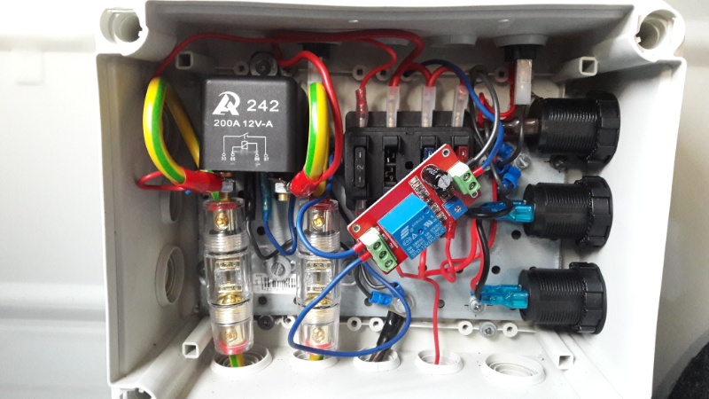 Also wurden nun ordentliche Kupferkabel (16mm^2) verlegt. Und nach einer Zwischenlösung mit einem Softwaregesteuerten Relais, habe ich mich final für die Schaltung mit einem einfachen 200A Relais und einer elektronischen Zeitschaltung (Verzögert „ein“) nach D+ Signal der Lichtmaschine entschieden.