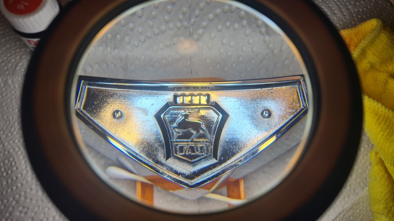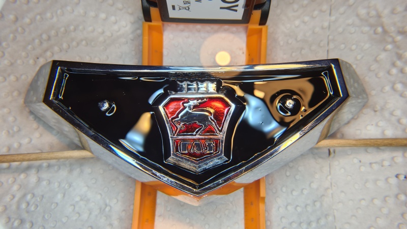 Das teure und schicke GAZ 24 Emblem, das ich für die Front des Fahrzeugs neu gekauft habe, erwies sich leider nach nur kurzer Zeit als nicht sehr beständig. Zwar war es von der Grundsubstanz deutlich besser als das Original (Rahmen aus Metall statt Kunststoff). Aber die Kunststoffeinlagen hielten nicht.