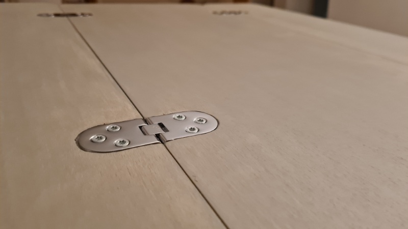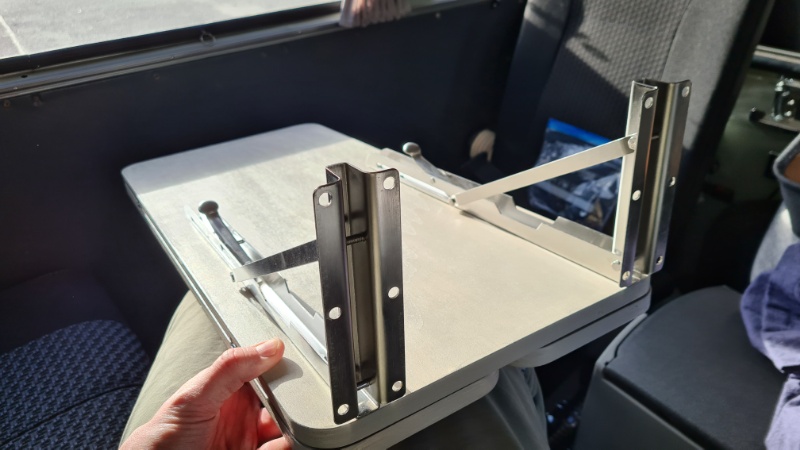 Ich habe mich für eine einfache Konstruktion aus leichtem Pappelsperrholz (15mm) entschieden. Eine variable Vergrößerung der Tischfläche (von 66 x 30 cm auf 66 x 60 cm) erfolgt über versenkbare Klappscharniere (BESTZY Innenscharnier). Das ganze wird über eine stabile Klappkonsole (OTraki Schwerlast Klappkonsole 400mm) gehalten, die mit Metallprofilen an der Fahrzeugwand befestigt sind.