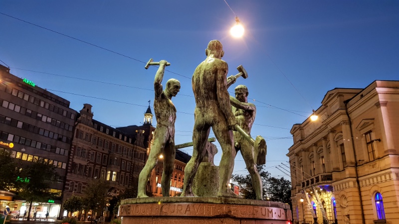 Und wieder sind wir von der schönen Stadt auch bei Nacht fasziniert. Wir staunen erneut über die Statue „Drei Schmiede“ aus den 1930-iger Jahren. Besonders darüber, dass die Statue heutzutage ein beliebter Treffpunkt ist. Warum? Durch ein unterirdisches Heizsystem (Fernwärmeabfluss der umliegenden Gebäude) werden Statue und Platz bis ca. −10 °C frei von Schnee und Eis gehalten. So kann man selbst im Winter an dieser Statue im Freien sitzen. Einfach genial! :-P