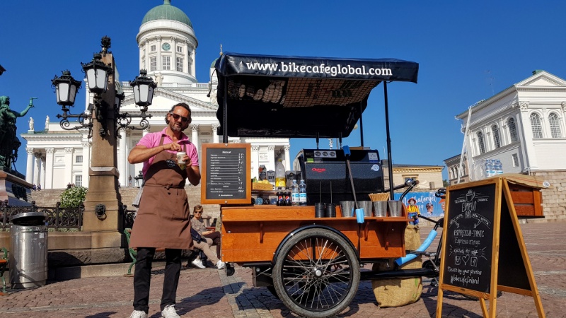 Nach so viel Farben brauchen wir erstmal frische Luft! Am schönen Dom von Helsinki treffen wir Muris vom Bike Cafe Finland. Auf einem Fahrrad zaubert er Kaffee-, Tee- und Milch-Spezialitäten in schönster Atmosphäre - und alles ohne Elektro-Antrieb. Respekt! :-D Wir wünschen ihm „Allet Jute“ mit diesem Konzept und lassen den Tag mit einem Shopping-Bummel ausklingen. 8-)