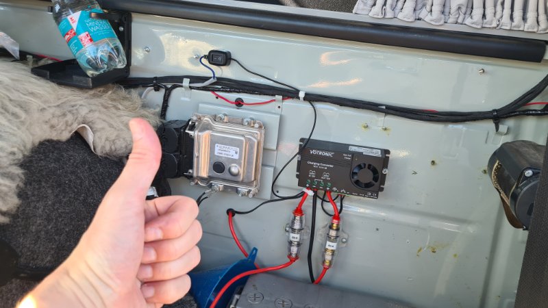 Unterwegs machen wir aber erst mal einen kleinen Zwischenstopp, um unseren Sicherungshalter zu reparieren. Der alte hatte die 60 A Sicherung nicht „fest“ genug gehalten und ist dadurch einfach „geschmolzen“. - „Na, da is eena aba glücklich, dat a wat zum Basteln hat, wa?!“ stellt Tom grinsend fest. Recht hat er! Wir freuen uns, dass es keine Folgeschäden gab und die Reparatur mit Klasse Ersatzteil schnell erledigt ist! ♥