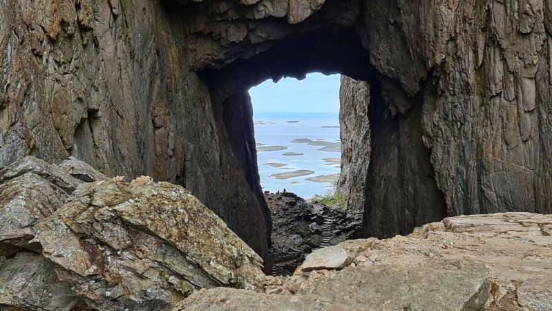 Heute kann man das Loch in einer kurzen aber steilen Wanderung erkunden. Von hier hat man einen fantastischen Ausblick auf die norwegische Schärenlandschaft.