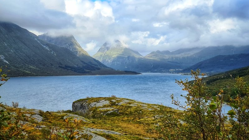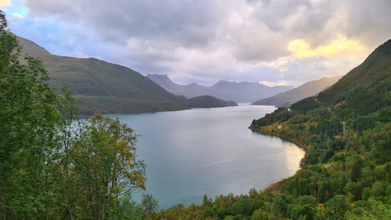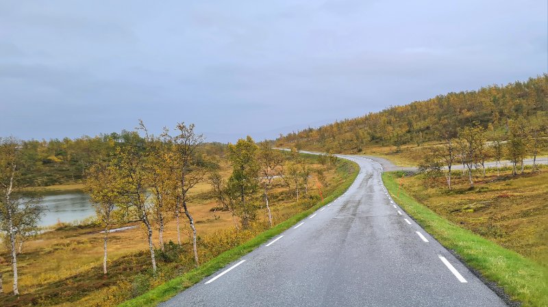 Wir verlassen den Kystriksveien und fahren über den Kulturveien durch herrliche Küsten- und Fjell-Landschaften. - Selbst bei Schmuddelwetter wirkt das herbstliche Gelb der Wiesen und Birken ganz betörend.