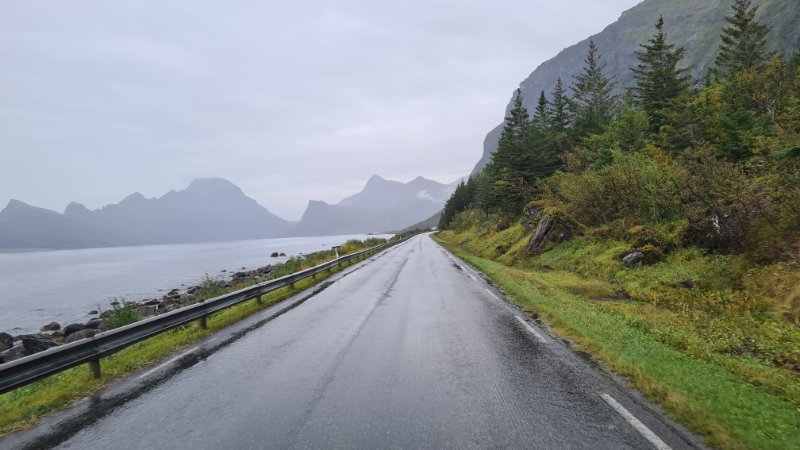Es geht weiter auf der F17 Richtung Norden. Wir fahren über die schöne, mehr als 1 km lange Helgelandsbrua und freuen uns über den Sonnenschein, der gleich wieder von Regenschauern abgelöst wird. LOL