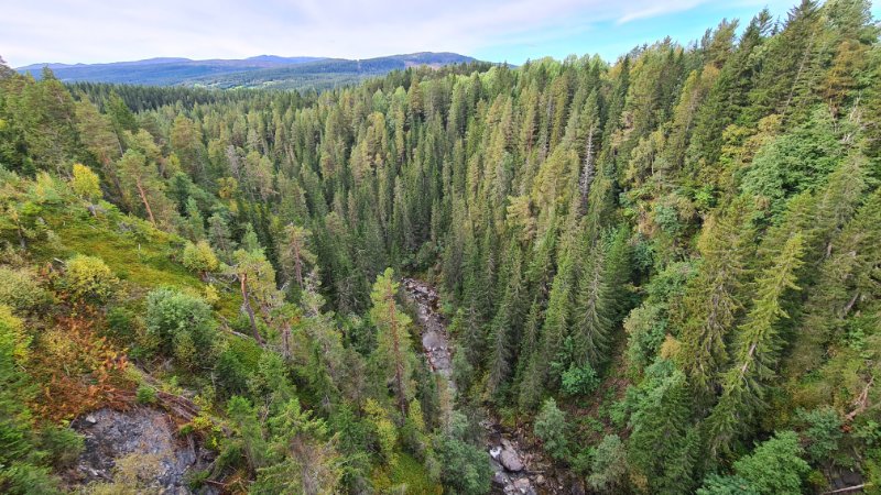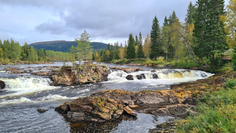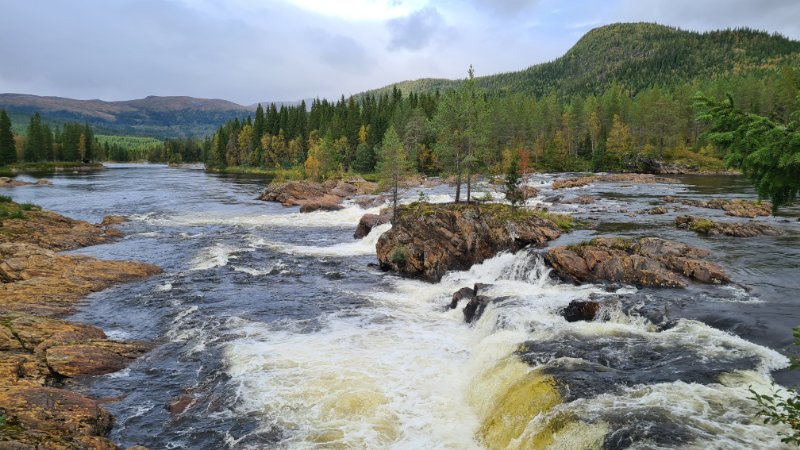 Wir nutzen die Regen-Pause und machen eine Mini-Wanderung zum Sandåmofossan direkt an der E6. Nicht sehr hoch, aber landschaftlich echt bezaubernd.