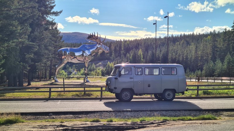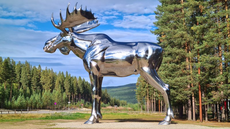 Durch Elchgebiete fahren wir weiter Richtung Oslo und kommen dabei am größten Elch der Welt vorbei. Mit über 10 m ist diese schöne Skulptur aus poliertem Stahl nicht nur ein gewaltiges Monument, sondern auch eine Verkehrssicherheitsmaßnahme, um vor den großen Wildtieren in dieser dünn besiedelten Gegend zu warnen.