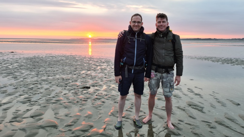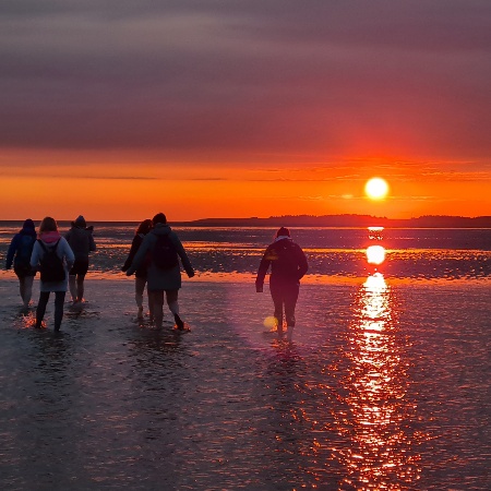 • Bei anfangs absoluter Dunkelheit und nur 13°C Lufttemperatur geht es von Norddorf auf Amrum zum Strand und dann barfuß ins Watt - das ist kalt, aber fühlt sich an wie als Kind - und macht Spaß :-P