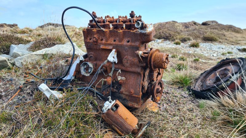 Wir erspähen auch, was die salzige Luft und das raue Klima in relativ kurzer Zeit hier mit Fahrzeugen macht. Wir untersuchen die Überreste eines (nur) ca. 50 Jahre alten Austin Morris MG 1100, der offensichtlich im Hochmoor stecken geblieben ist. - Die Karosserie hat sich schon komplett aufgelöst, selbst das Fahrwerk und schwere Eisenträger sind einfach zu Rost zerfallen (welch passendes Thema für diesen RostBlog). - Gut dass wir heute ohne Olga unterwegs sind.