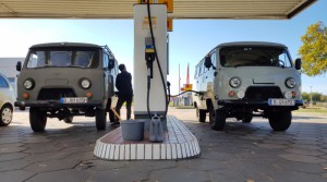 Der UAZ Bus hat zwei Tanks - einen großen mit ca. 50 Litern (links) und einen kleinen mit ca. 27 Litern (rechts). Während der Fahrt „pullert“ der Inhalt vom rechten, kleinen Tank in den linken, großen Tank (Venturi Düse). Der rechte, kleine Tank ist also als erstes leer.