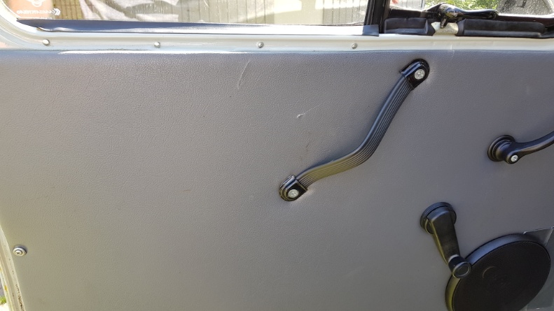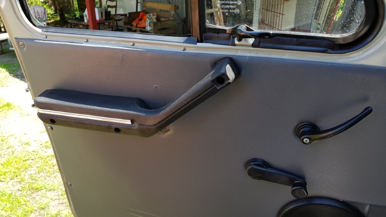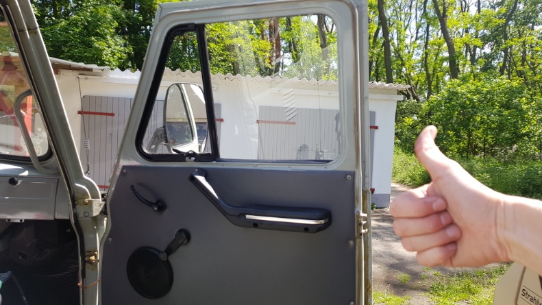 Wem es auf dem Beifahrersitz doch zu eng wird, dem können wir folgende „hybride“ Lösung empfehlen, die bei uns zum bequemen Erfolg geführt hat. Sie besteht aus dem originalen Türband (für mehr Knie-Freiheit) plus der halben, umgedrehten Lada-Armlehne (als Ellenbogen-Stütze). ♥