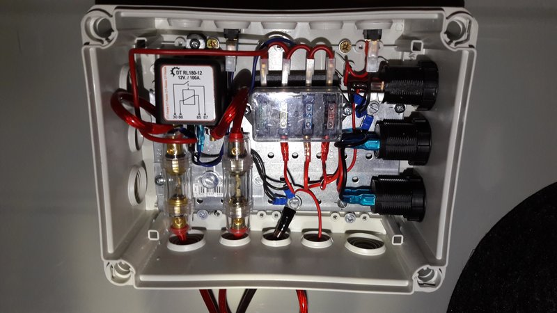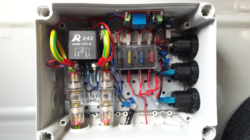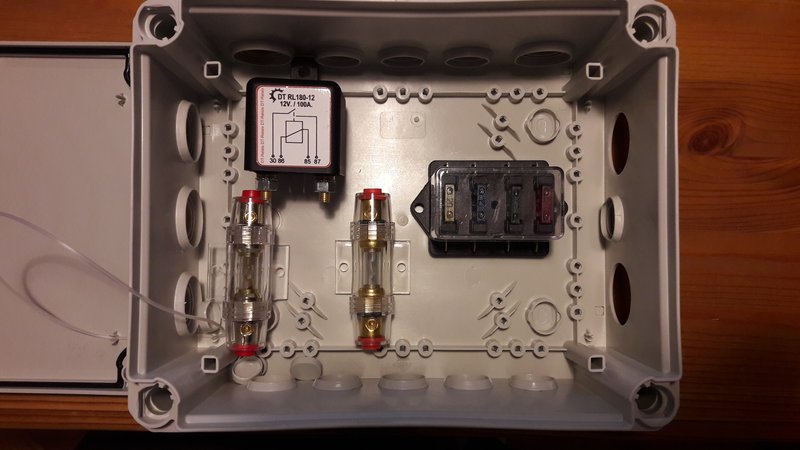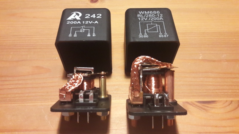 Also wurden nun ordentliche Kupferkabel (16mm^2) verlegt. Und nach einer Zwischenlösung mit einem Softwaregesteuerten Relais, habe ich mich final für die Schaltung mit einem einfachen 200A Relais und einer elektronischen Zeitschaltung (Verzögert „ein“) nach D+ Signal der Lichtmaschine entschieden.