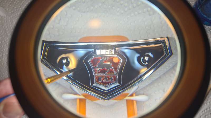 Das teure und schicke GAZ 24 Emblem, das ich für die Front des Fahrzeugs neu gekauft habe, erwies sich leider nach nur kurzer Zeit als nicht sehr beständig. Zwar war es von der Grundsubstanz deutlich besser als das Original (Rahmen aus Metall statt Kunststoff). Aber die Kunststoffeinlagen hielten nicht.